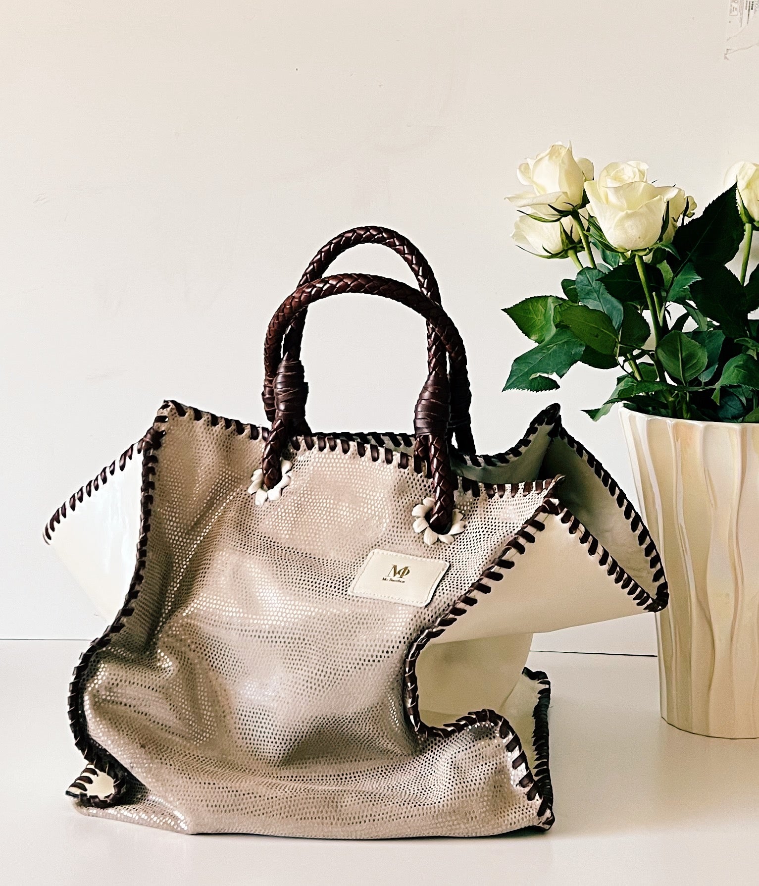 This tote brings together leather chosen for their leather texture and character.